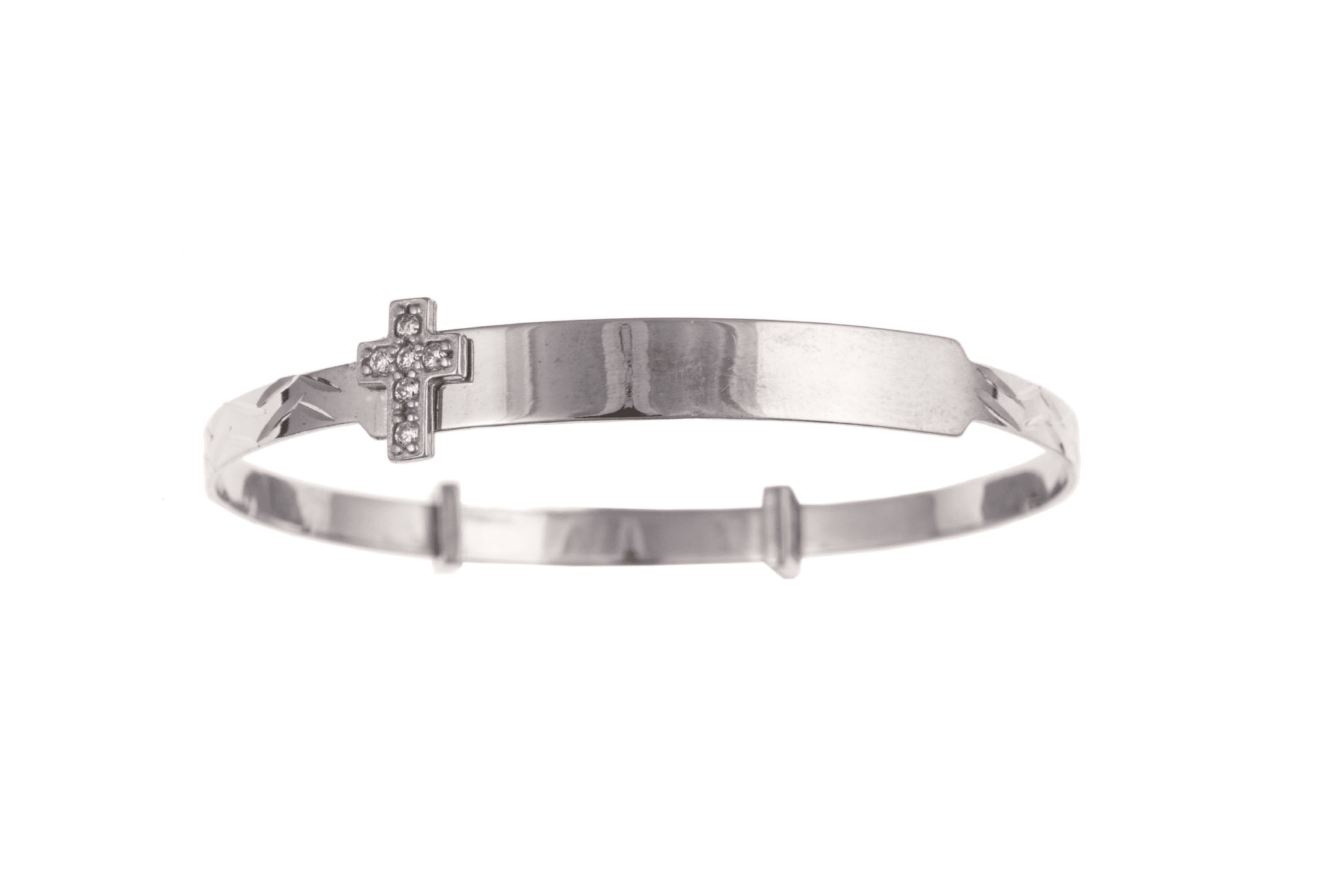 A diamond etched pattern expanding bangle with an engraving plate to the front set with a Cubic zirconia Cross.