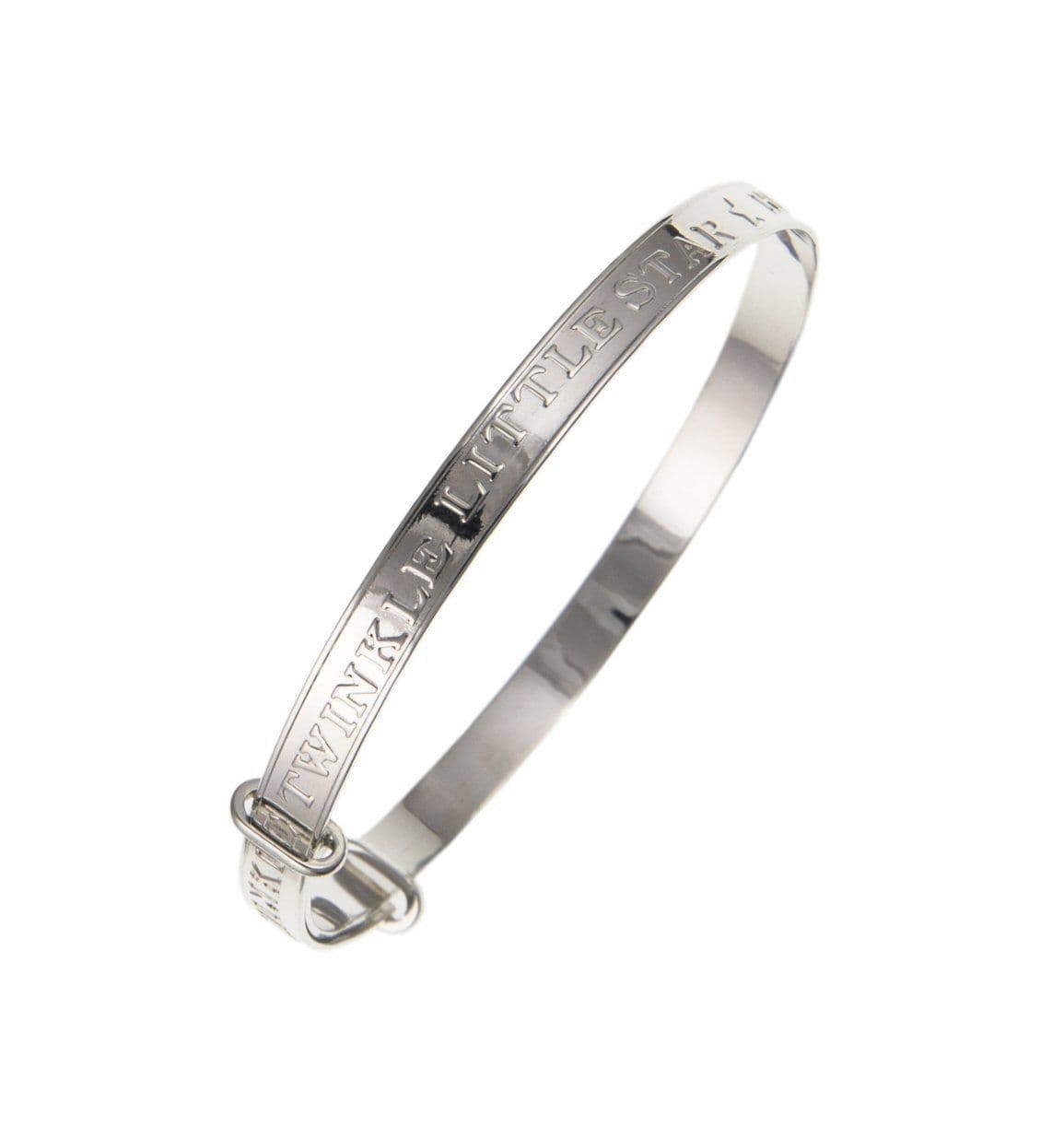A really lovely plain bangle engraved with the wording from the famous nursery rhyme 'TWINKLE TWINKLE LITTLE STAR HOW I WONDER WHAT YOU ARE' around the body of it.